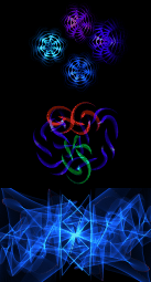 The last precomputed relaxation is that of a six-component Brunnian link. The final state of this link can be seen in all its raytraced glory, floating deep beneath the sea (load Brun and go Brun).
