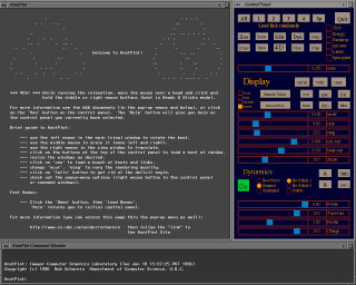 Here we see the usual initial statup configuration with the view window, control panel, and command window. These windows may be resized and repositioned as desired. In fact, one useful thing to do after one is familiar with the layout of the control panel is to make it as small as possible. This opens more screen area for the view window but still allows for control of the program. Advanced users can even run without the control panel and command window.